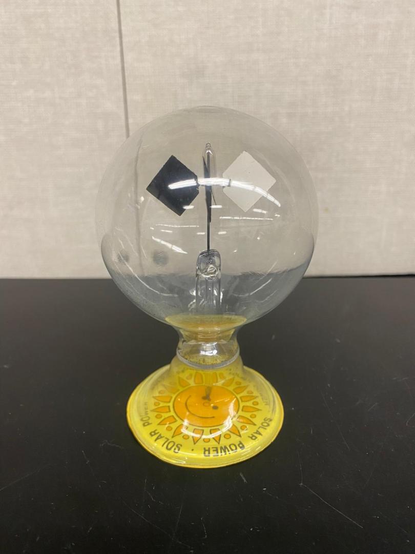 A Crookes radiometer consists of an airtight glass bulb with a partial vacuum inside and a set of vanes (one side black, the other side white) free to rotate about a low-friction central axis. When exposed to light, the vanes rotate, demonstrating the conversion of light energy into mechanical energy (a heat engine powered by light). The speed of rotation is proportional to the intensity of the incoming light.